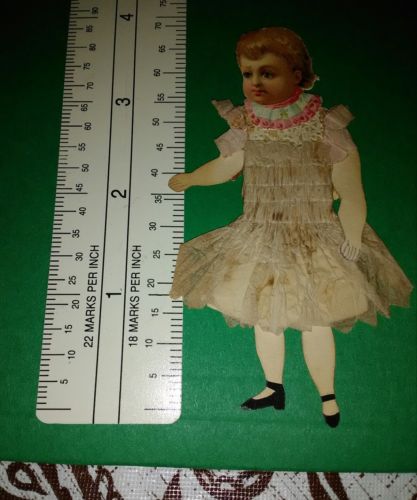 Title (ebay affiliate link): Paper doll, color litho scrap head, c1900, tissue paper shirred dress, hand-made