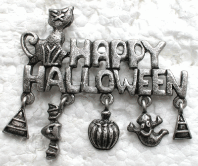 ANTIQUE SILVER TONE HAPPY HALLOWEEN PIN BROOCH HD12