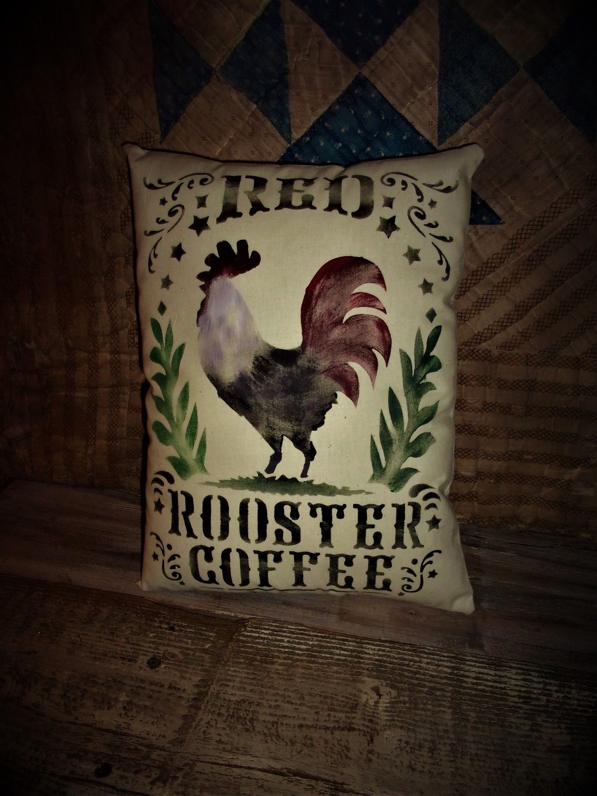** Primitive 9x11 in Rooster Coffee PILLOW Country Rusty doll B7**