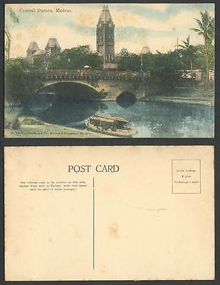India Old Hand Tinted Postcard Central Station Madras Bridge Boat, Railway Train