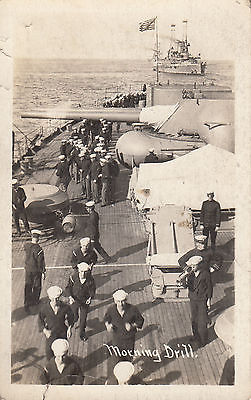 Original WWI RPPC Photo Postcard US Navy BATTLESHIP MORNING DRILL UNDER GUNS 29