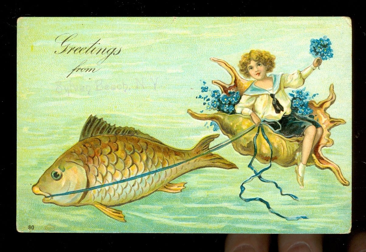 Title (ebay affiliate link): Greetings from Sylvan Beach, New York-1910-carp & flower boy
