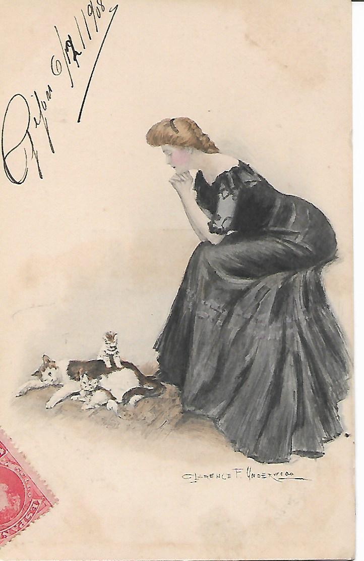 Title (ebay affiliate link): 19??-VINTAGE ART NOUVEAU -SIGNED-UNDERWOOD CLARENCE-WOMAN WITH CAT- OLD PC-154