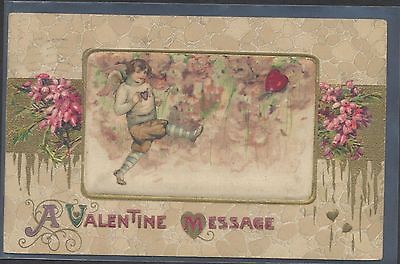 1911 Valentines Day picture postcard Silk Center Cupid Kicking Heart