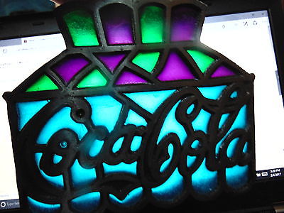 Vintage Coca-Cola Stained Glass Look Sun Catcher 6"x5" iron w blue/green/purple