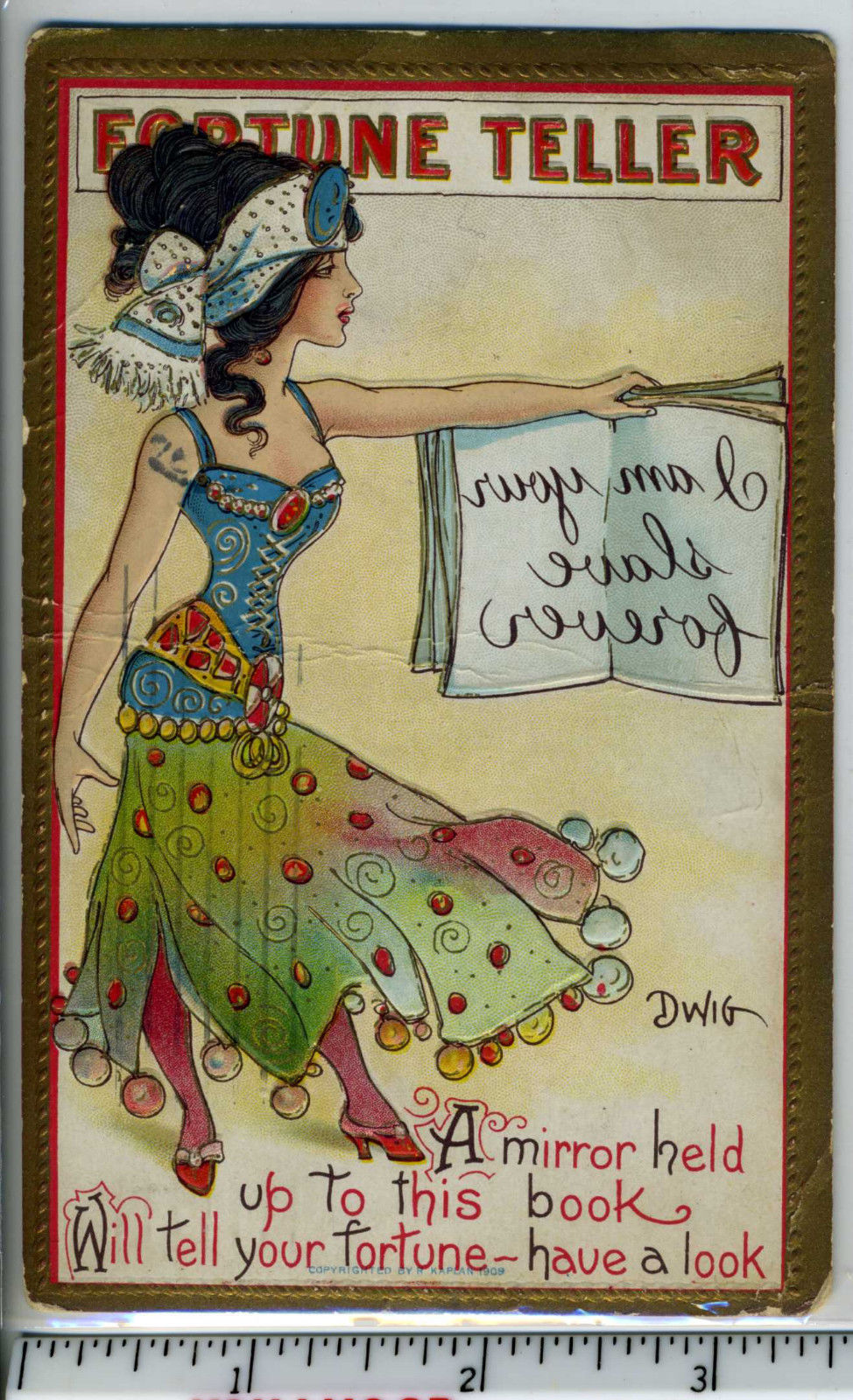 Vintage postcard, Dwig Fortune Teller valentine, message displayed on open book