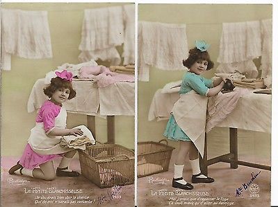 Postcard Young girl ironing and tidying clothes REUTLIUZER 1920 X 2