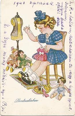 Children, Girl Sewing Clothes for her Toy Dolls, Funny Old Postcard