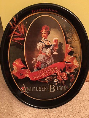 Title (ebay affiliate link): Anheuser Busch 1987 Reproduction of 1886 German Barmaid Ad Budweiser Beer Tray