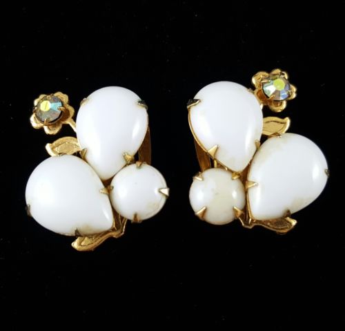 Title (ebay affiliate link): Sign BEAUJEWELS Vintage Clip Earrings White Milk Glass Flower AB Rhinestone O118