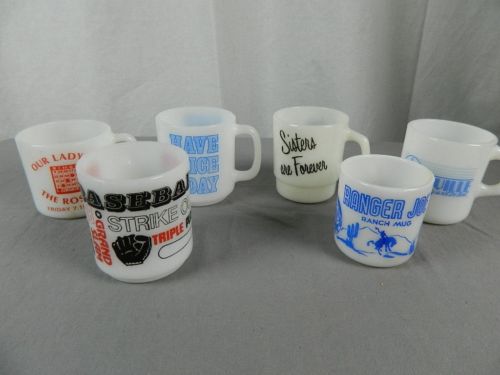 Title (ebay affiliate link): Lot of 6 Milk Glass Galaxy Hocking Glasbake Coffee Tea Mugs Ranger Joe Sisters