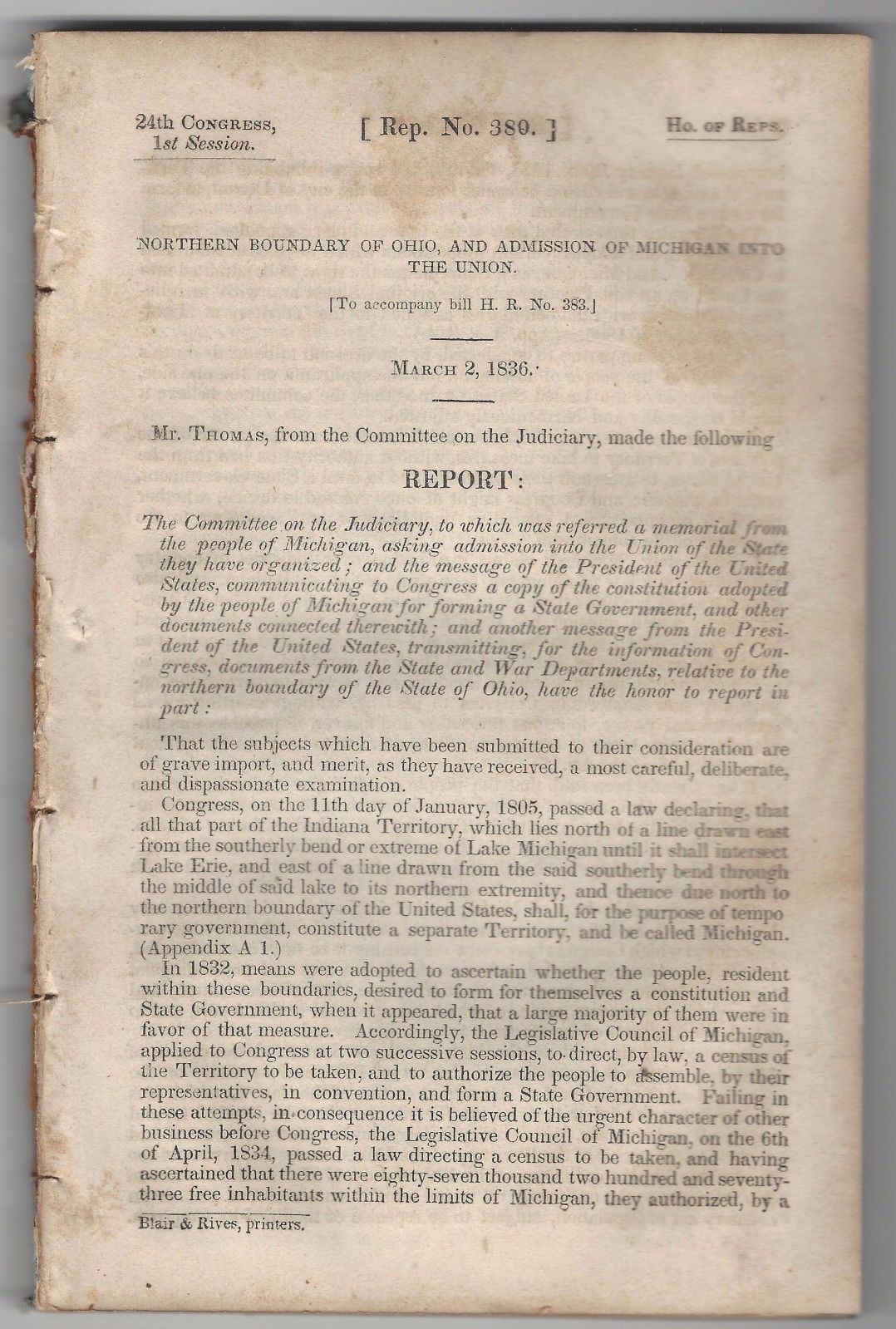 Title (ebay affiliate link): 1836 Report Northern Boundary of Ohio and Admission of Michigan into the Union