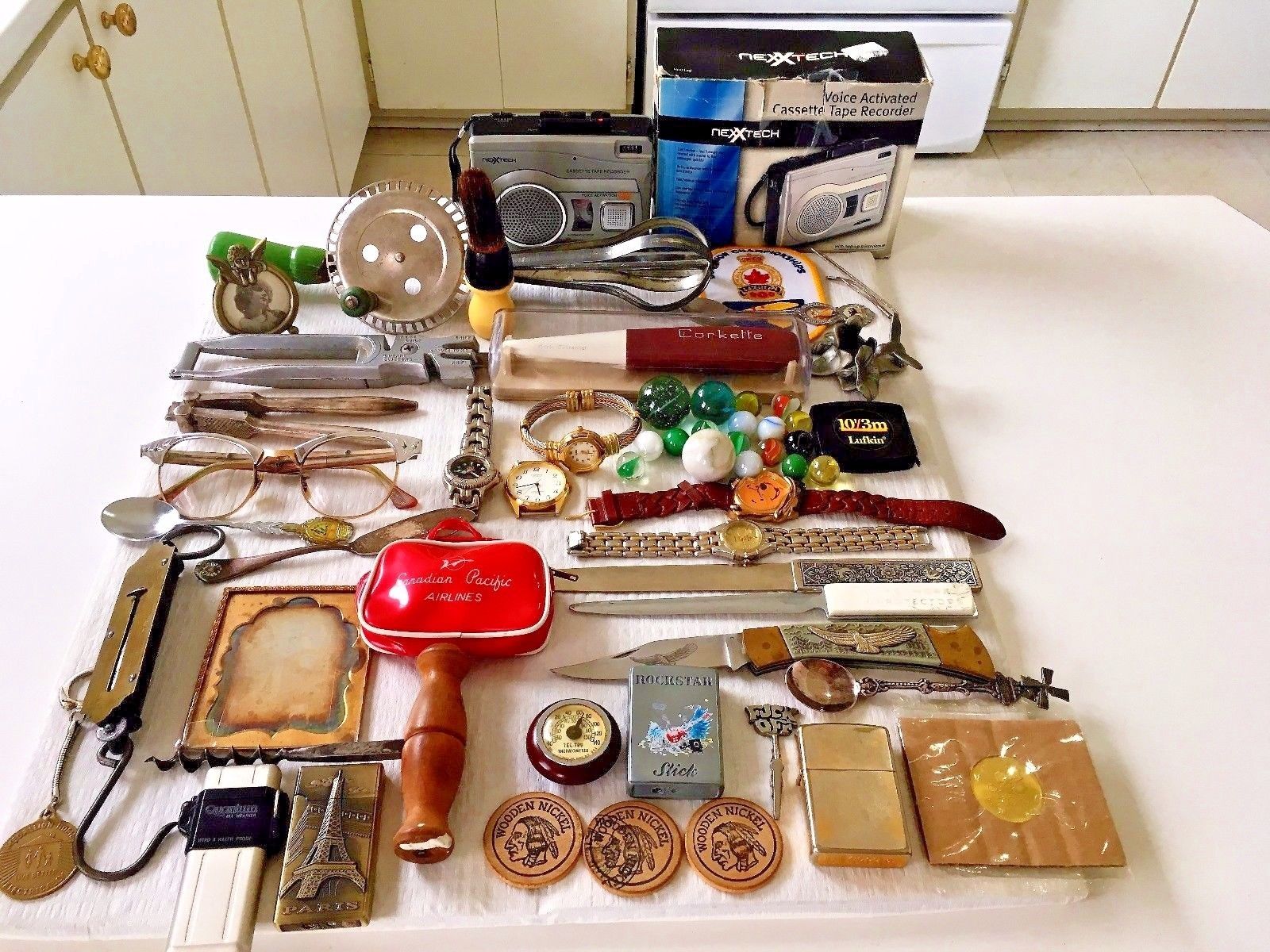 Title (ebay affiliate link): Vintage Junk Drawer lot, Zippo+lighters, coca cola coin, watches,Knife MORE!!!!