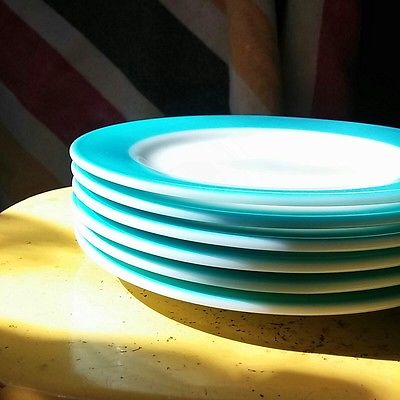 Title (ebay affiliate link): RARE VINTAGE PYREX plate set of 6 AQUA band MILK GLASS 1950s