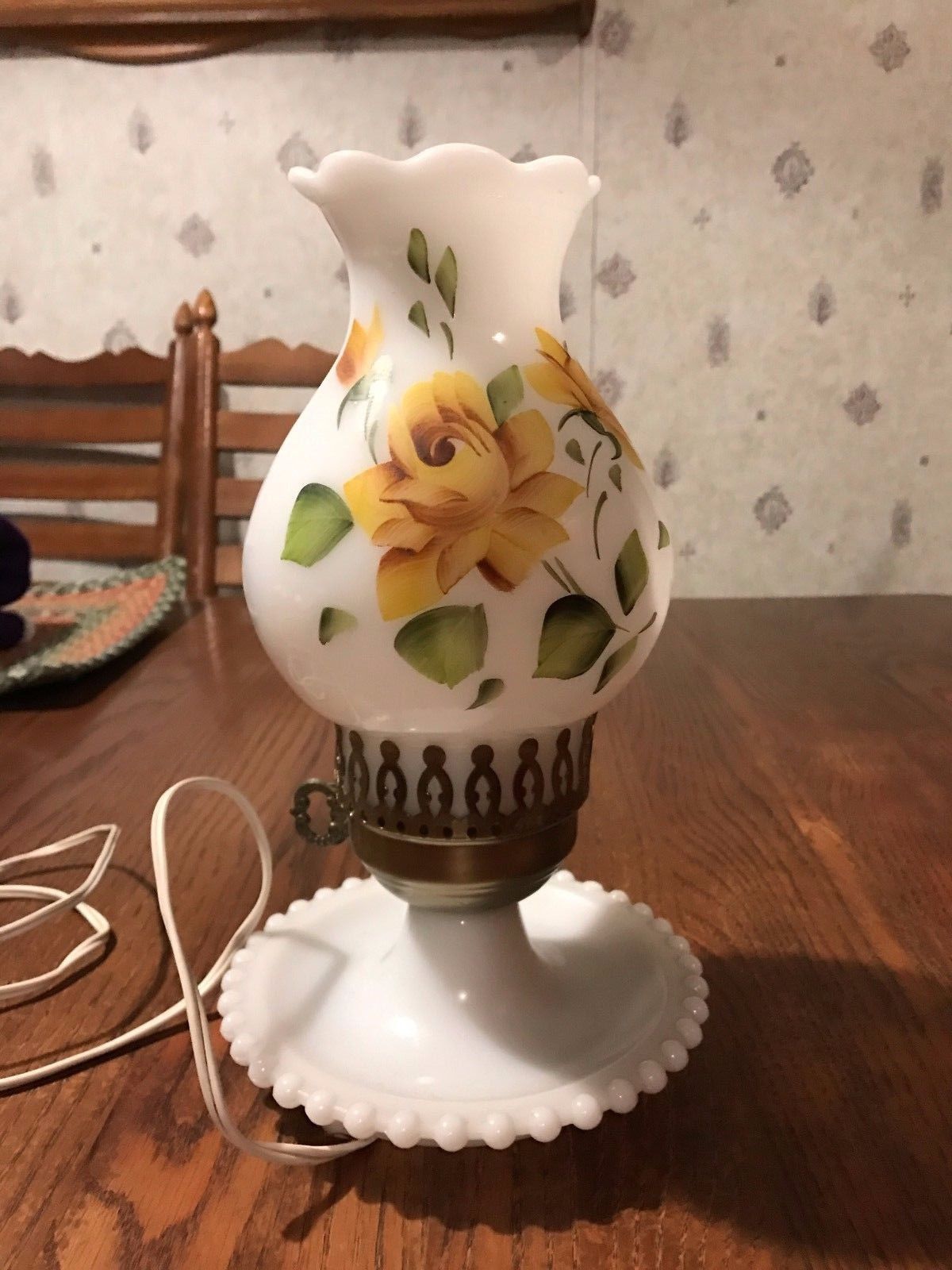 Title (ebay affiliate link): Vintage 10.5 " Hurricane Electric White Milk Glass Lamp WITH FLORAL DESIGN