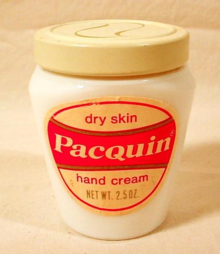 Title (ebay affiliate link): VINTAGE PACQUIN HAND CREAM MILK GLASS JAR WITH PAPER LABELS AND METAL LID