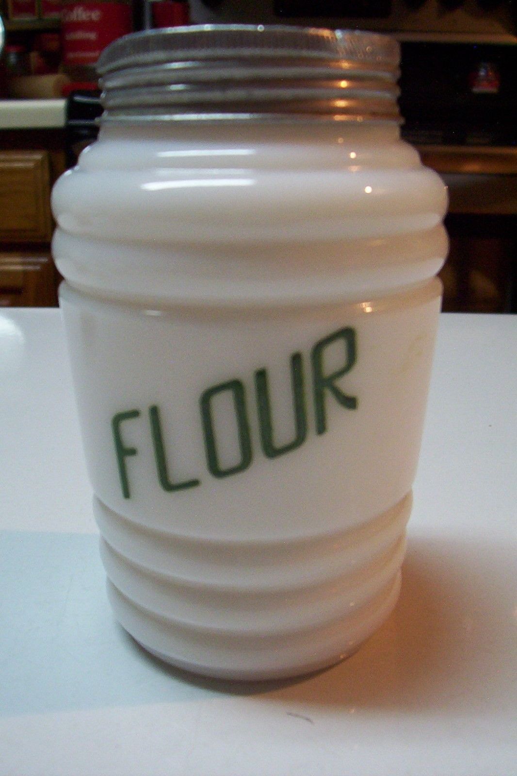 Title (ebay affiliate link): Vintage White Milk Glass Round Flour Shaker with Green Lettering Range Set