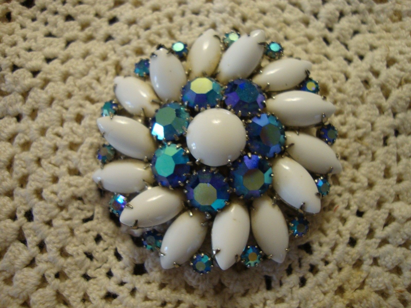 Title (ebay affiliate link): Vintage Estate Weiss Milk Glass and Blue Iridescent Rhinestone Brooch