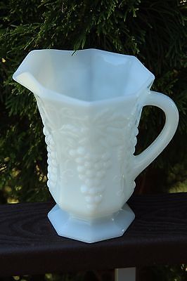 Vintage Milk Glass Pitcher, grape motif, octagonal, panels