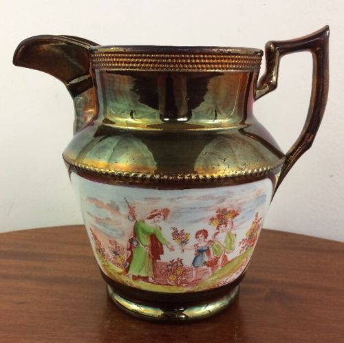 Vintage Copper Lusterware Pitcher with Allegorical Landscape Scene