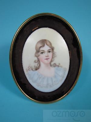 Antique Hand Painted Portrait on Porcelain Young Woman in 6"x5" Oval Metal Frame