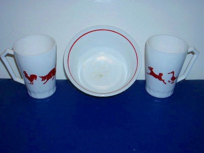 3 Pieces Milk Glass Child Cups & Bowl Red Farm Animals
