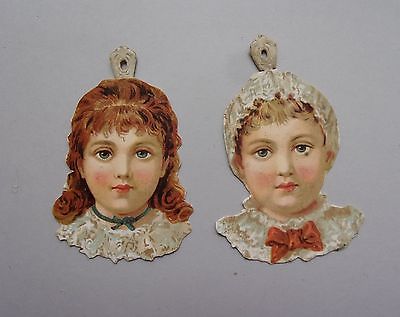 two ANTIQUE Lithograpend BOY & GIRL PAPER HEADS CHRISTMAS ORNAMENT