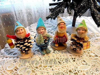 Title (ebay affiliate link): SET of 4 ANTIQUE Pixie PINE CONE ELVES Colorful POINTED HATS PIPE CLEANER ARMS