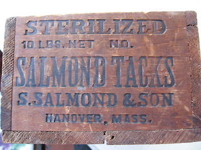 Antique 10 lbs Wood Box STERILIZED SALMOND TACKS Hanover Mass.Cranberry boxes