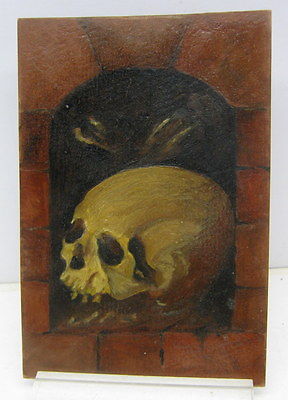 Antique Memento Mori Vanitas - Oil on cardboard Painting Skull Catacomb