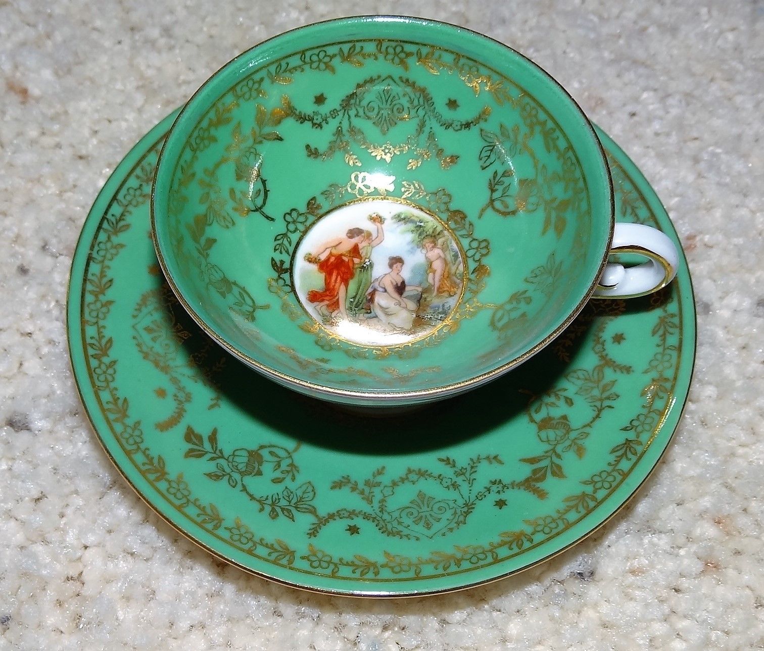 Germany tea cup and saucer cameo portrait green and gold and gold