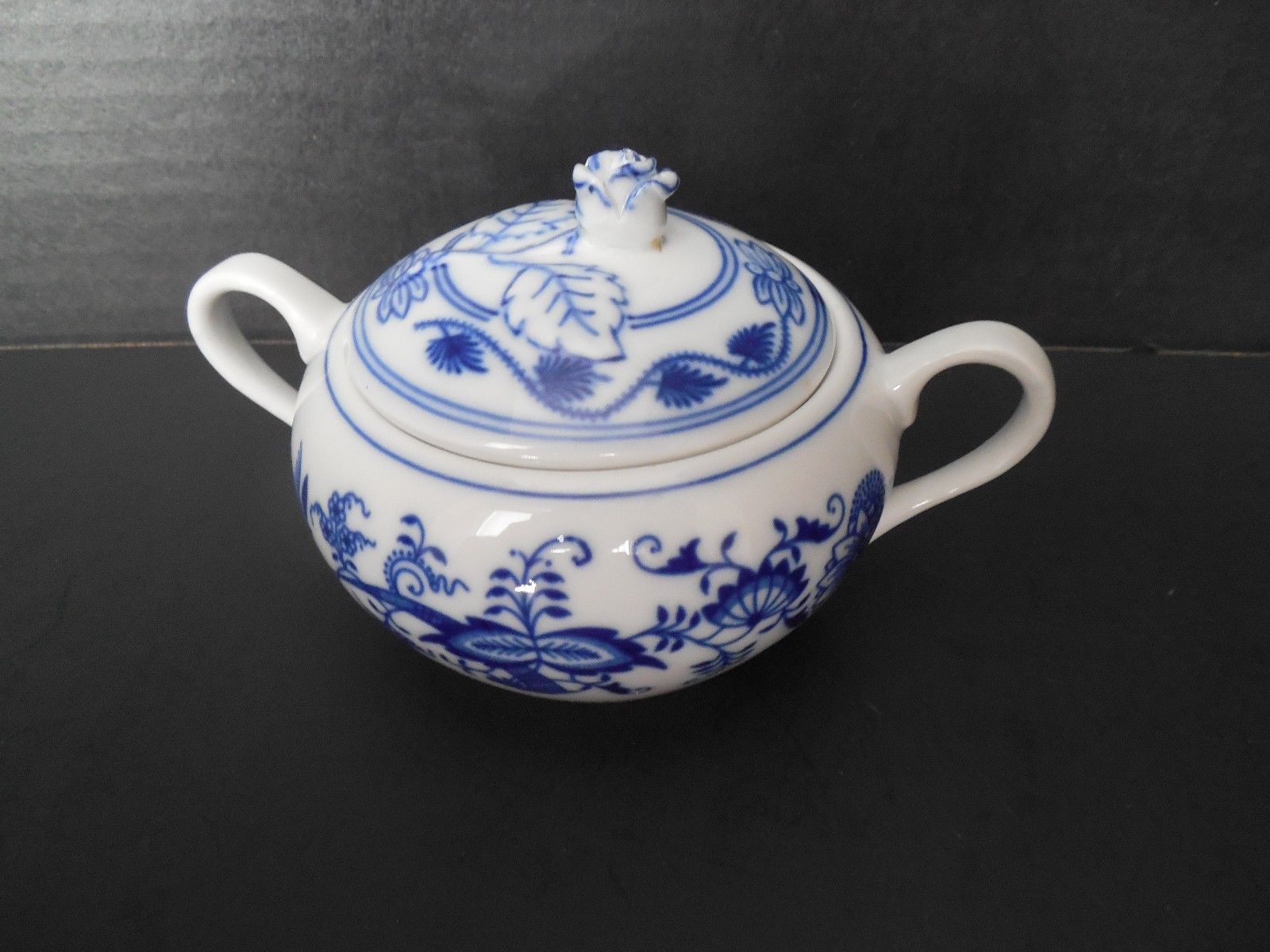 Title (ebay affiliate link): Zwiebelmuster porcelain Blue Onion covered sugar bowl from Czech Republic