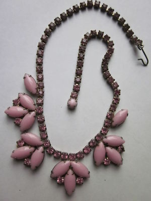 PRETTY !! VINTAGE PINK MILK GLASS & RHINESTONE NECKLACE