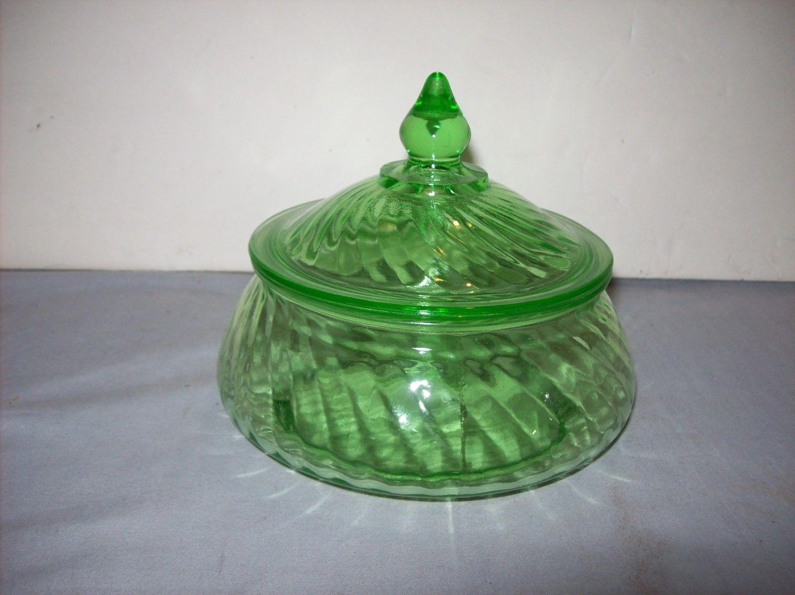 Title (ebay affiliate link): Depression Hocking glass green swirl candy dish and lid, 5 3/4" d