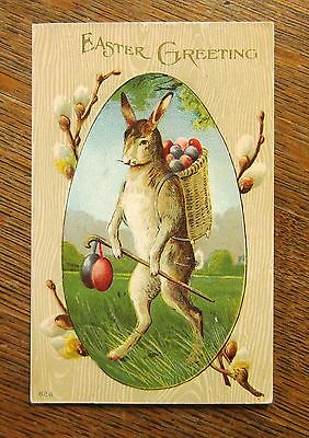 FANTASY Easter BUNNY Rabbit WALKING Colored EGGS--Vintage Antique EMB Postcard!