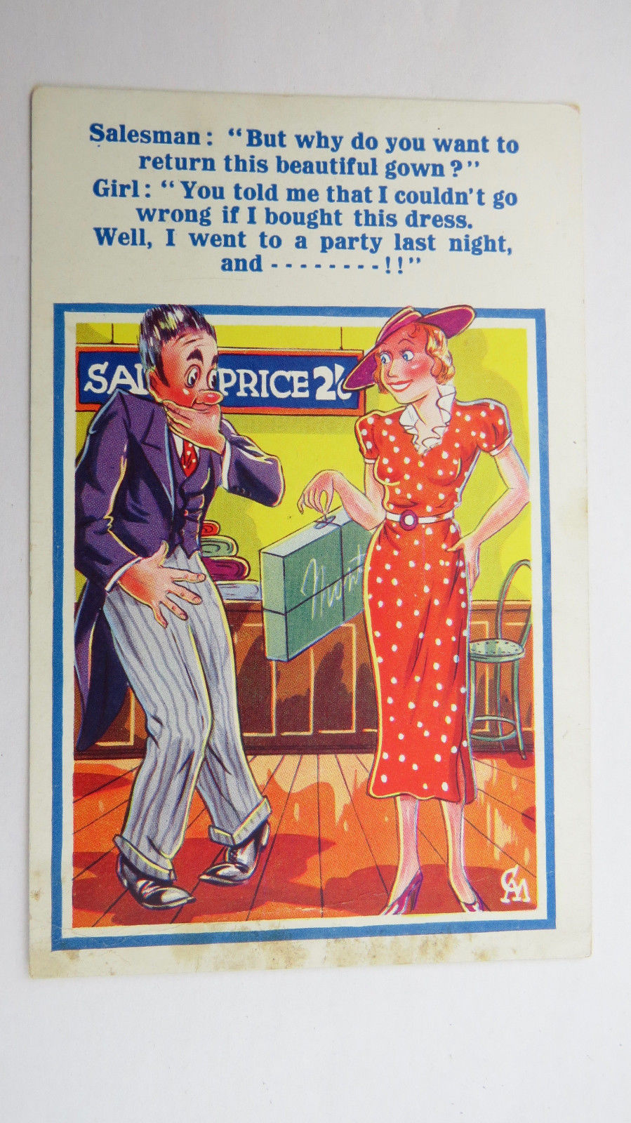 Title (ebay affiliate link): 1950s Inter-Art Vintage Comic Risque Postcard Fashion Gown Dress Shop Blonde