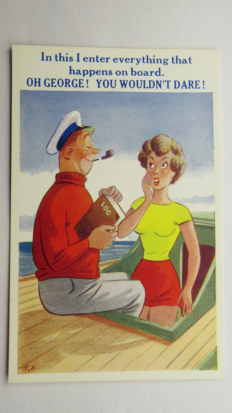 Title (ebay affiliate link): 1950s Risque Sunshine Comic Postcard Big Boobs Sailor Captain''s Log George Boat