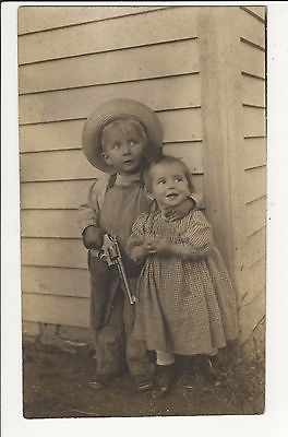 RPPC Young Boy & Girl Boy Hat Pistol Gun Holster Home Guard Vintage Postcard