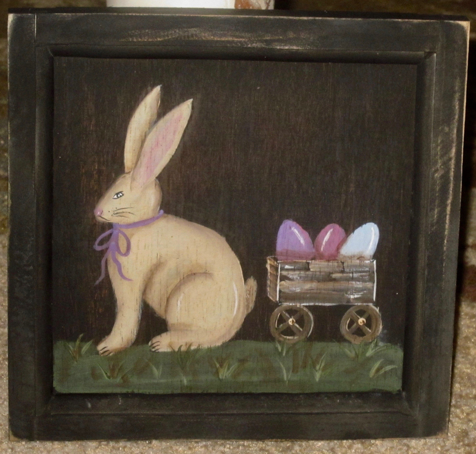 *~*PRIMITIVE*~* HP FOLK ART BUNNY * EGGS IN CART * EASTER *~* SM. DOOR PANEL