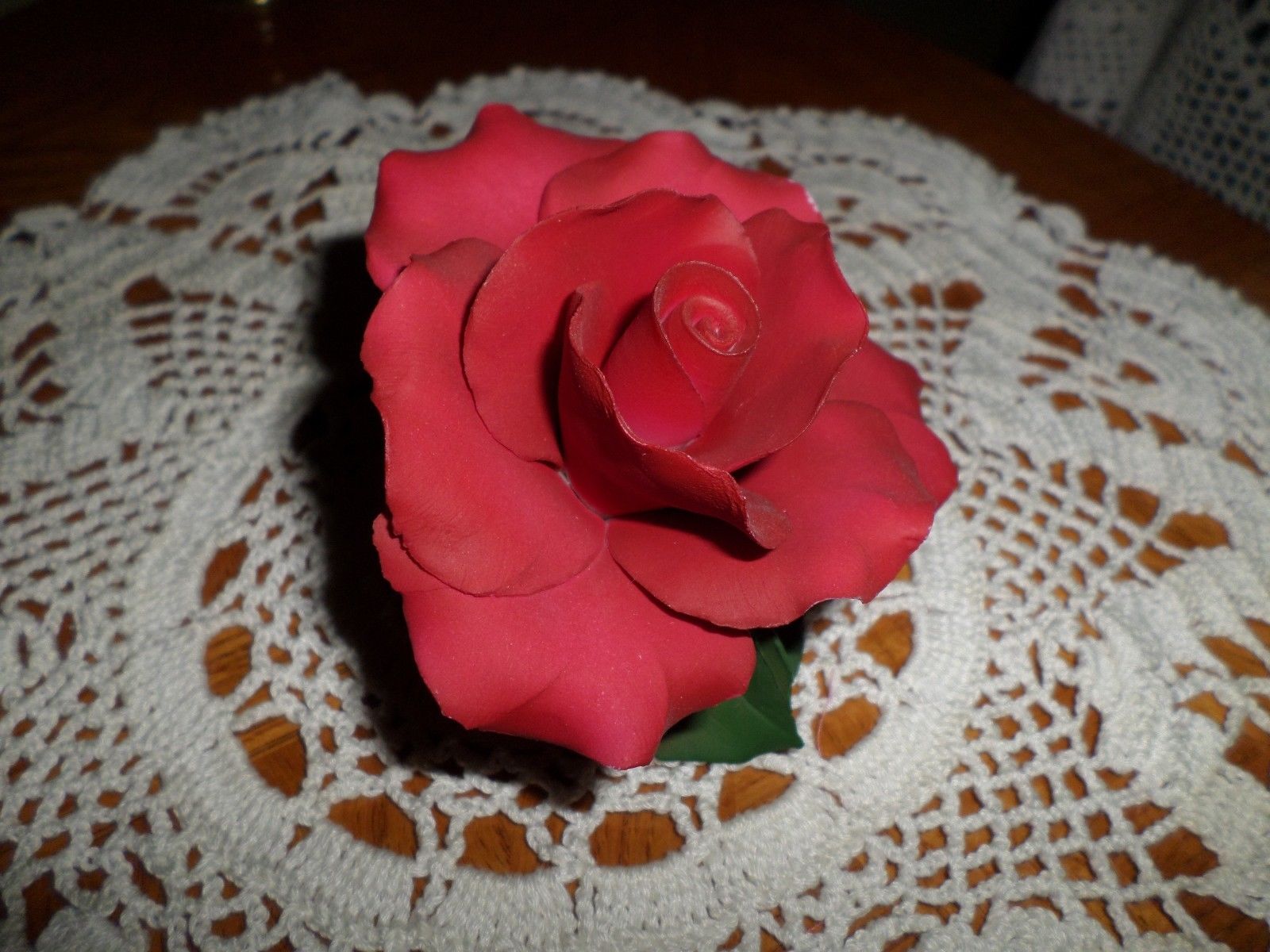 Title (ebay affiliate link): Deep Red Rose Porcelain Flower Leaf Base Fabar Capodimonte Italy