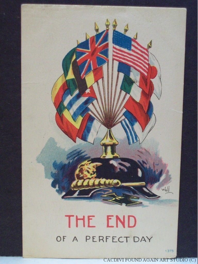 WWI Allies Flags Top German Spiked Helmet Propaganda Postcard End of Perfect Day