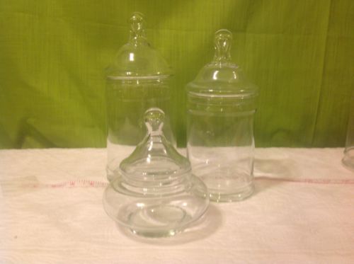 Title (ebay affiliate link): Vintage Clear Glass Apothecary Wedding/ Candy Lidded Jars Lot Of 3
