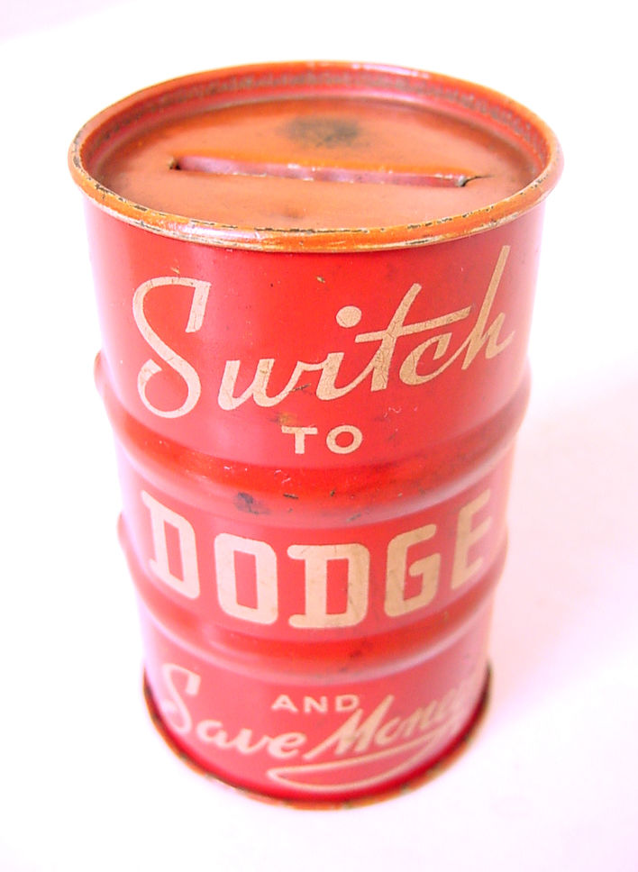 Title (ebay affiliate link): 1930S "SWITCH TO DODGE AND SAVE MONEY" 3.25" METAL OIL BARREL PROMO SAVINGS BANK