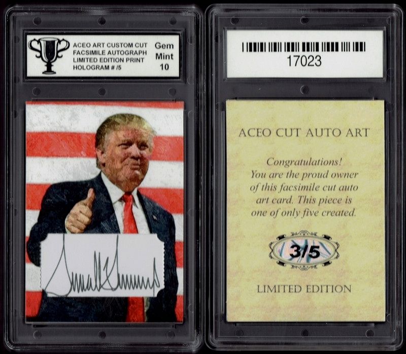 Title (ebay affiliate link): DONALD TRUMP ACEO Brush Art Print FACSIMILE AUTOGRAPH Card #/5 GRADED 10 GEM