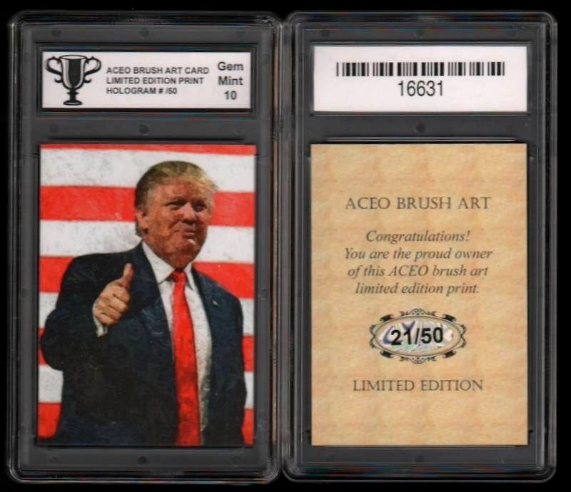 Title (ebay affiliate link): DONALD TRUMP ACEO Brush Art Print Card HOLOGRAM LIMITED # /50 GRADED 10 GEM MINT