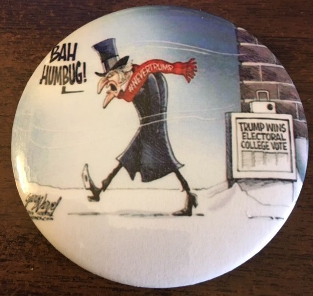 Title (ebay affiliate link): 3" NeverTrumpers Claiming "Bah Humbug" Over Trump Electoral Win Pinback Button