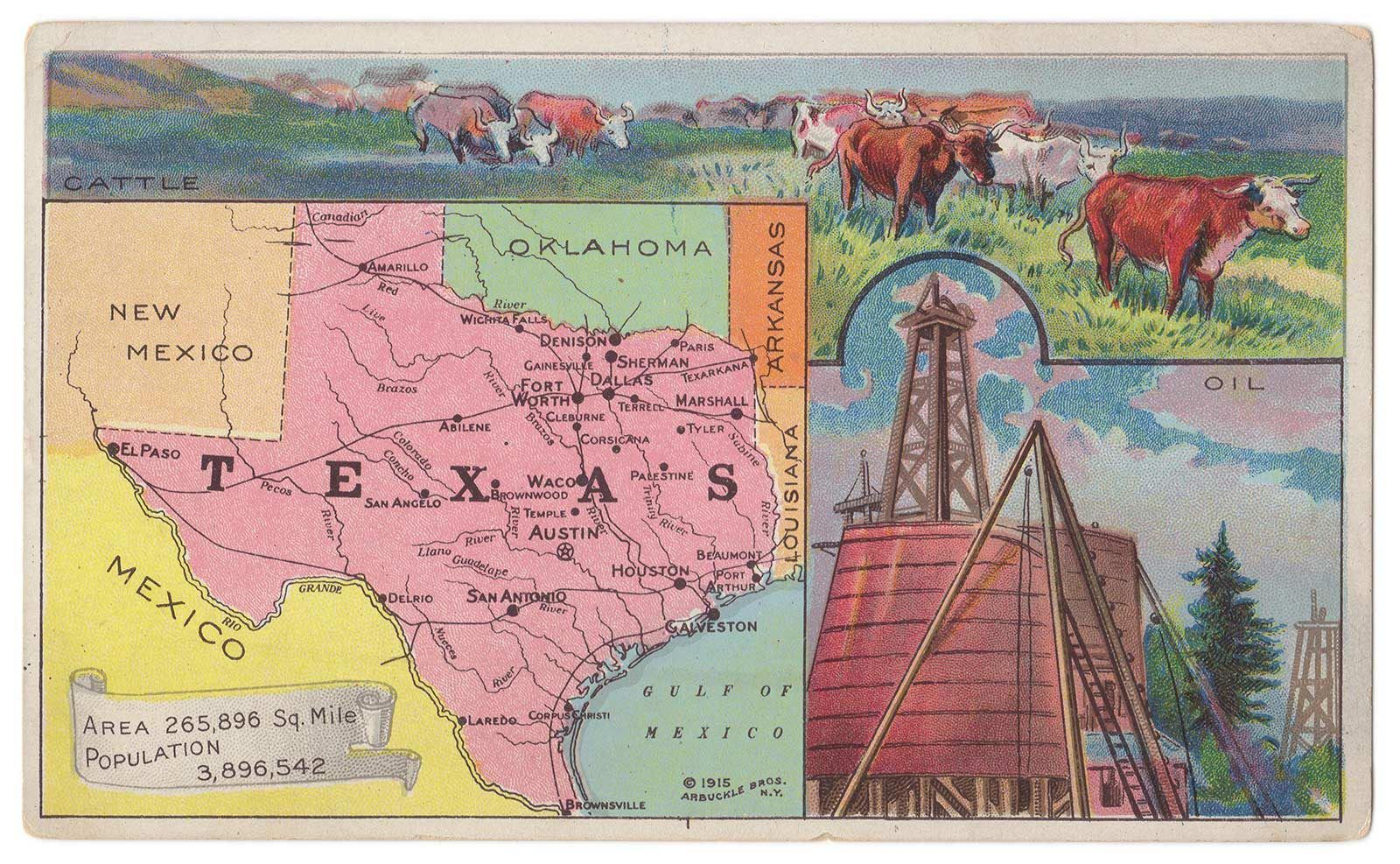 Title (ebay affiliate link): Arbuckle Coffee STATE ATLAS MAP CARD of TEXAS #42 2nd Issue 1915 Cattle & Oil