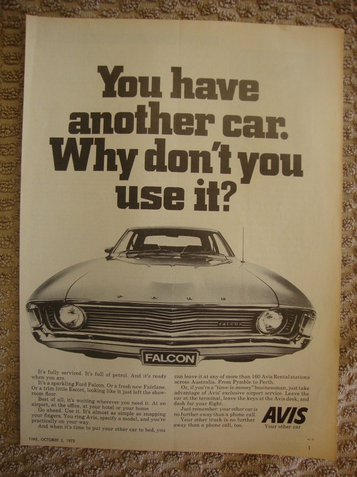 Title (ebay affiliate link): 1972 Avis Rent A Car XA Ford Falcon Aussie Original Magazine Advertisement
