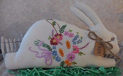 Primitive Vintage Embroidered Tablecloth Easter Bunny Pillow Tuck Shelf Sitter