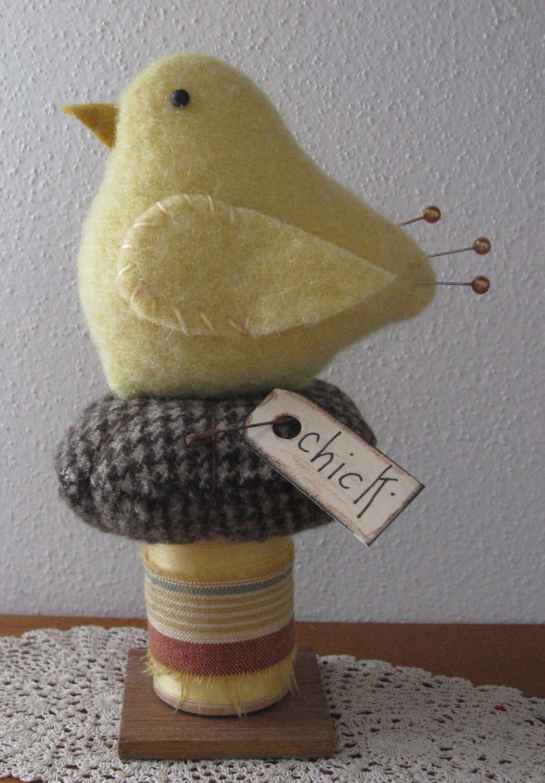 Title (ebay affiliate link): PRIMITIVE WOOL EASTER YELLOW BABY CHICK BIRD THREAD MAKE DO PIN CUSHION PFATT